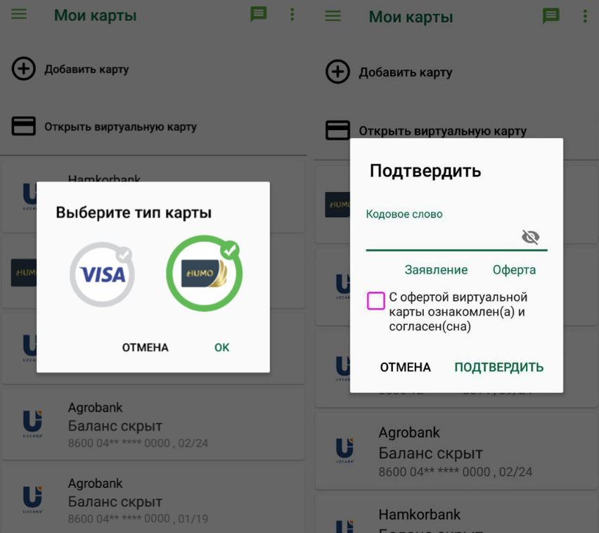 2. В открывшемся окне вы должны выбрать тип карты – Humo или Visa Virtual, а после поставить галочку на изображение логотипа, ознакомиться с офертой, ввести кодовое слово и нажать на кнопку «подтвердить», после чего карта автоматически будет добавлена в приложение.