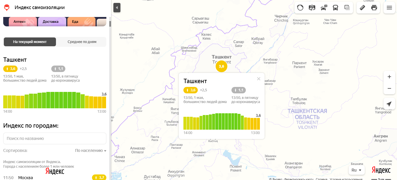 В Ташкенте на момент 13:50 1 мая индекс самоизоляции упал до 3,6 баллов. 30 апреля средний индекс самоизоляции по дням впервые упал до 3,9 баллов. Стоит отметить, что весь апрель уровень самоизоляции не опускался ниже 4 баллов.