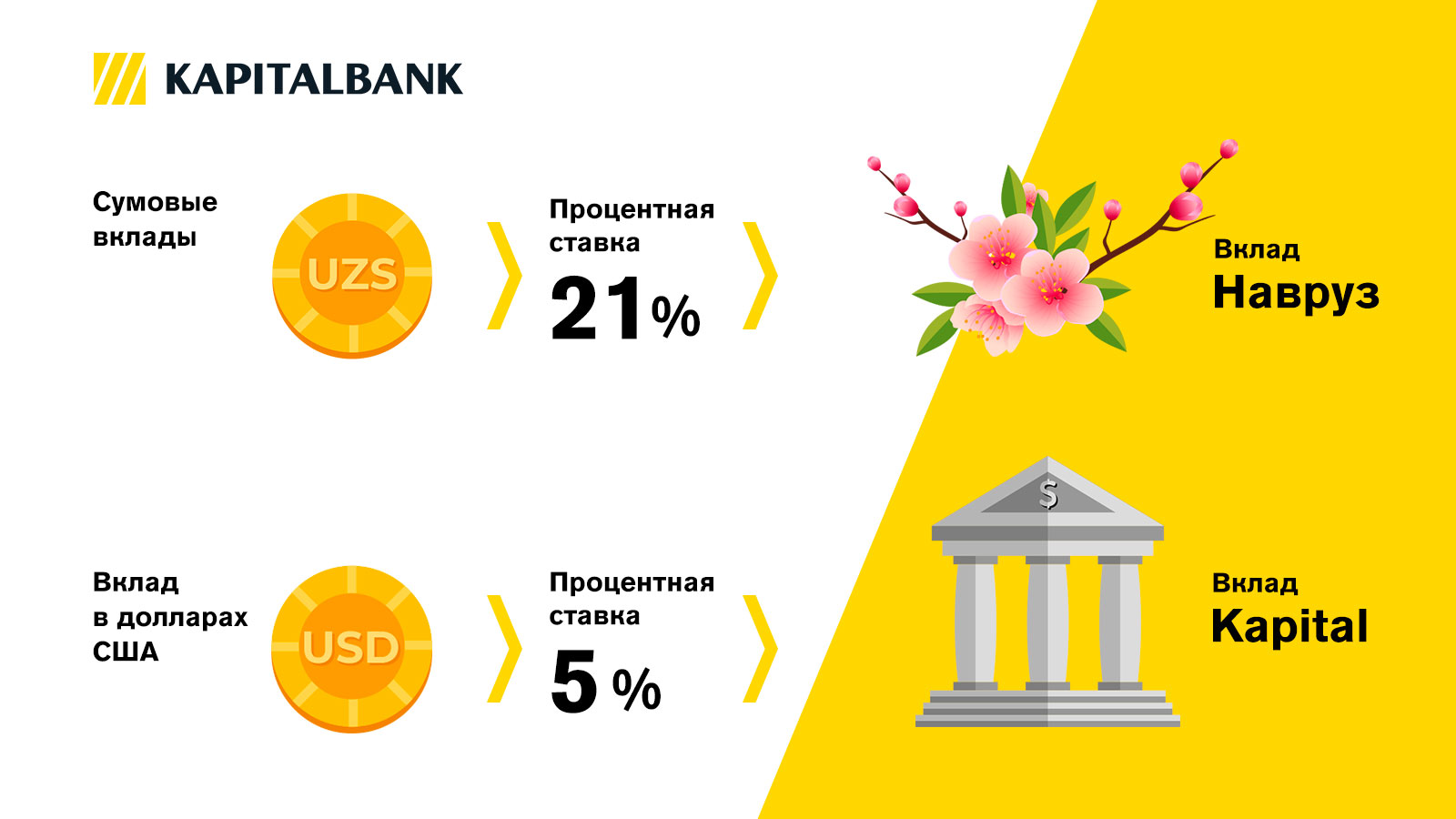 Сумовые вклады «Капиталбанка» будут переведены на вклад «Навруз» с годовой процентной ставкой в 21%. Вклады в долларах США переведут на вклад Kapital, который приносит вкладчикам 5% годовых. Срок вкладов – 36 месяцев.