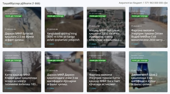 Всего было отдано более 16 млн голосов за 33 680 инициатив. По итогам голосования выиграли 1 666 предложений, которые получат финансирование в размере 1,57 трлн сумов.