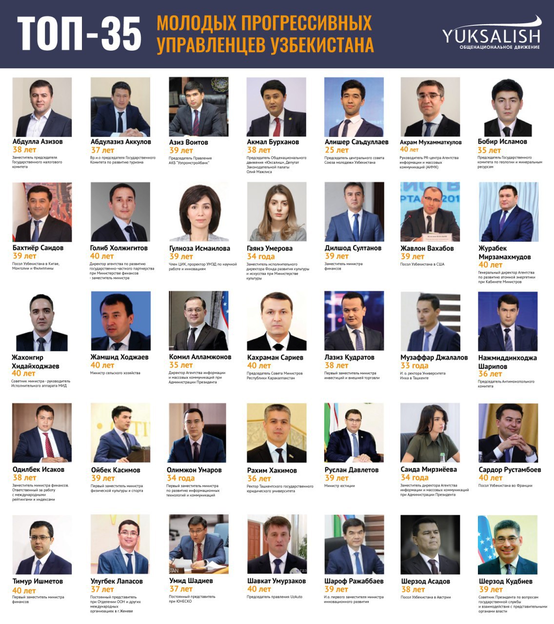 Общенациональное движение «Юксалиш» совместно с экспертами Института социальных и экономических инициатив сформировали Топ-35 управленцев, которые сегодня находятся в центре масштабных преобразований, выполняют важные задачи.