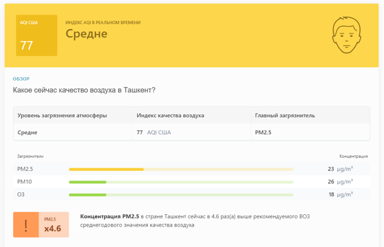 В 09:20 станция мониторинга в столице Узбекистана показывала результат в 77 AQI. Концентрация PM2.5 — в 4,6 раза выше рекомендуемого ВОЗ среднегодового значения качества воздуха.