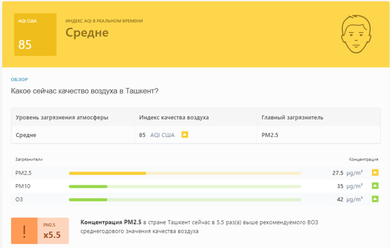 В 09:45 станция мониторинга в столице Узбекистана показывала результат в 85 AQI. Концентрация PM2.5 — в 5,5 раза выше рекомендуемого ВОЗ среднегодового значения качества воздуха.