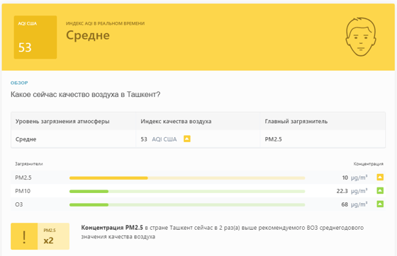 В 08:40 станция мониторинга в столице Узбекистана показывала результат в 53 AQI. Концентрация PM2.5 — в 2 раза выше рекомендуемого ВОЗ среднегодового значения качества воздуха.