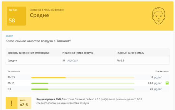 В 08:30 станция мониторинга в столице Узбекистана показывала результат в 58 AQI. Концентрация PM2.5 — в 2,6 раза выше рекомендуемого ВОЗ среднегодового значения качества воздуха.