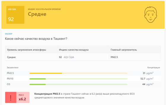 В 09:00 станция мониторинга в столице Узбекистана показывала результат в 92 AQI. Концентрация PM2.5 — в 6,2 раза выше рекомендуемого ВОЗ среднегодового значения качества воздуха.