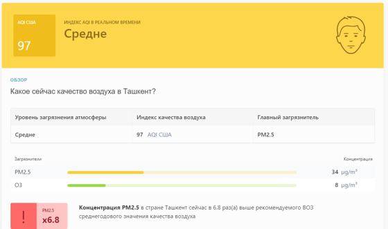 В 08:55 станция мониторинга в столице Узбекистана показывала результат в 97 AQI. Концентрация PM2.5 — в 6,8 раза выше рекомендуемого ВОЗ среднегодового значения качества воздуха.