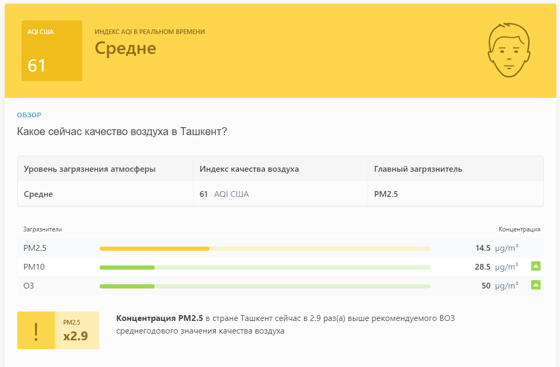 В 08:50 станция мониторинга в столице Узбекистана показывала результат в 61 AQI. Концентрация PM2.5 — в 2,9 раза выше рекомендуемого ВОЗ среднегодового значения качества воздуха.