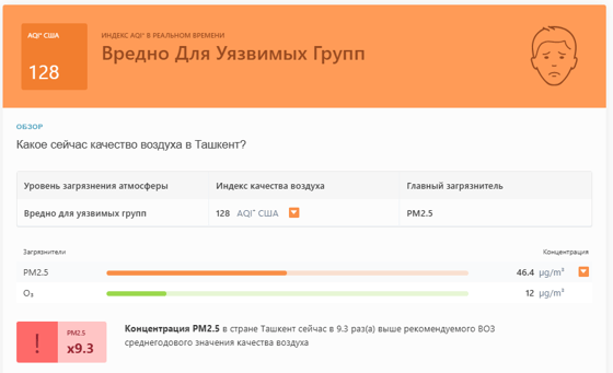 В 09:00 станция мониторинга в столице Узбекистана показывала результат в 128 AQI. Концентрация PM2.5 — в 9,3 раза выше рекомендуемого ВОЗ среднегодового значения качества воздуха.