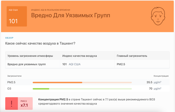 В 13:00 станция мониторинга в столице Узбекистана показывала результат в 101 AQI. Концентрация PM2.5 — в 7,1 раза выше рекомендуемого ВОЗ среднегодового значения качества воздуха.