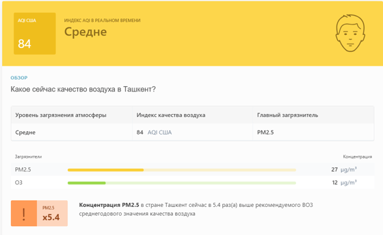 В 09:05 станция мониторинга в столице Узбекистана показывала результат в 84 AQI. Концентрация PM2.5 — в 5,4 раза выше рекомендуемого ВОЗ среднегодового значения качества воздуха.