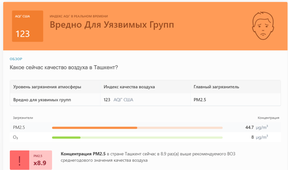 В 09:10 станция мониторинга в столице Узбекистана показывала результат в 123 AQI. Концентрация PM2.5 — в 8,9 раза выше рекомендуемого ВОЗ среднегодового значения качества воздуха.