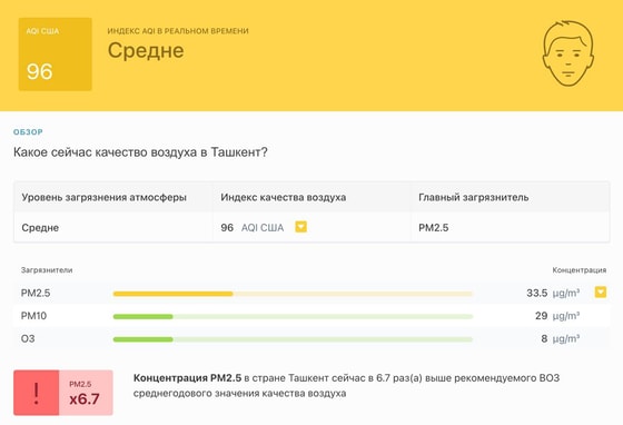 В 09:45 станция мониторинга в столице Узбекистана показывала результат в 96 AQI. Концентрация PM2.5 — в 6,7 раза выше рекомендуемого ВОЗ среднегодового значения качества воздуха.