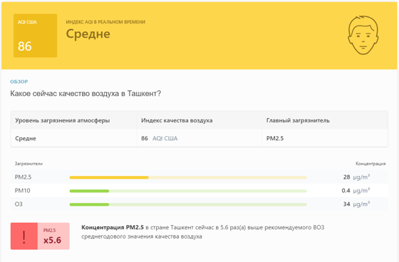 В 10:45 станция мониторинга в столице Узбекистана показывала результат в 86 AQI. Концентрация PM2.5 — в 5,6 раза выше рекомендуемого ВОЗ среднегодового значения качества воздуха.
