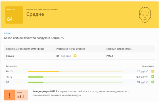 В 10:25 станция мониторинга в столице Узбекистана показывала результат в 84 AQI. Концентрация PM2.5 — в 5,4 раза выше рекомендуемого ВОЗ среднегодового значения качества воздуха.