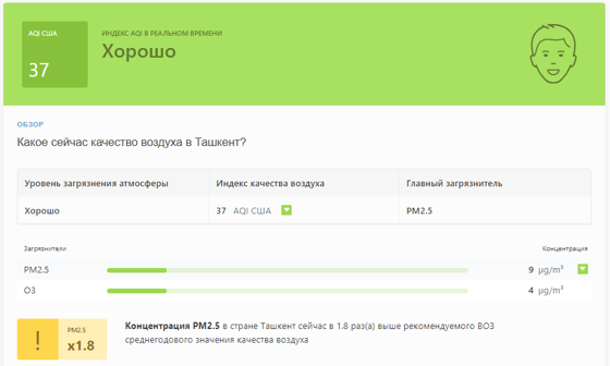 В 10:40 станция мониторинга в столице Узбекистана показывала результат в 37 AQI. Концентрация PM2.5 — в 1,8 раза выше рекомендуемого ВОЗ среднегодового значения качества воздуха.