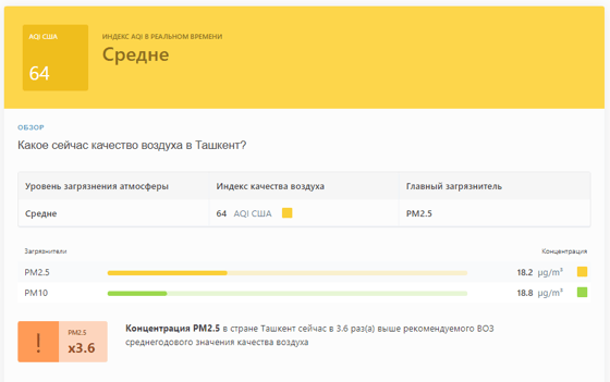 В 08:25 станция мониторинга в столице Узбекистана показывала результат в 64 AQI. Концентрация PM2.5 — в 3,6 раза выше рекомендуемого ВОЗ среднегодового значения качества воздуха.