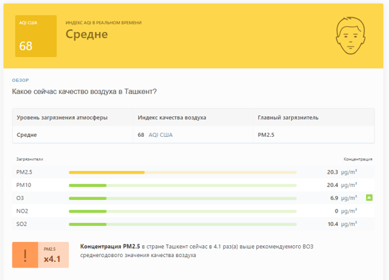 В 09:05 станция мониторинга в столице Узбекистана показывала результат в 68 AQI. Концентрация PM2.5 — в 4,1 раза выше рекомендуемого ВОЗ среднегодового значения качества воздуха.