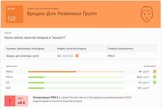 В 09:05 станция мониторинга в столице Узбекистана показывала результат в 122 AQI. Концентрация PM2.5 — в 8,8 раза выше рекомендуемого ВОЗ среднегодового значения качества воздуха.