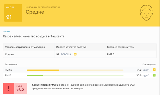В 12:00 станция мониторинга в столице Узбекистана показывала результат в 91 AQI. Концентрация PM2.5 — в 6,2 раза выше рекомендуемого ВОЗ среднегодового значения качества воздуха.