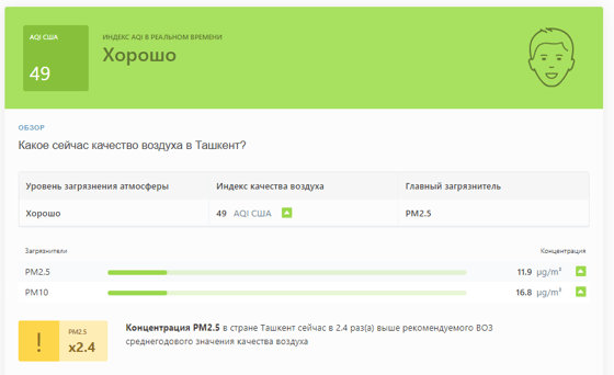 В 07:25 станция мониторинга в столице Узбекистана показывала результат в 49 AQI. Концентрация PM2.5 — в 2,4 раза выше рекомендуемого ВОЗ среднегодового значения качества воздуха.
