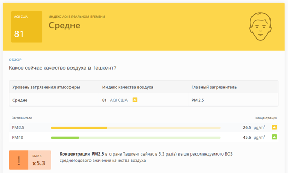 В 08:30 станция мониторинга в столице Узбекистана показывала результат в 81 AQI. Концентрация PM2.5 — в 5,3 раза выше рекомендуемого ВОЗ среднегодового значения качества воздуха.