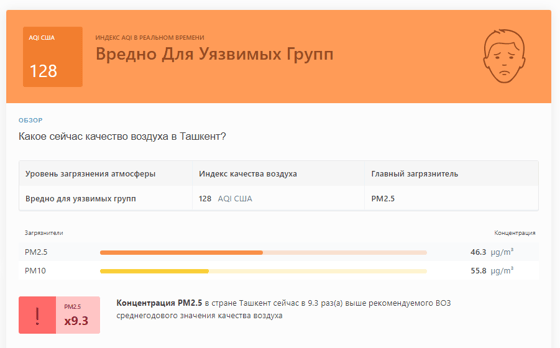 В 08:55 станция мониторинга в столице Узбекистана показывала результат в 128 AQI. Концентрация PM2.5 — в 9,3 раза выше рекомендуемого ВОЗ среднегодового значения качества воздуха.