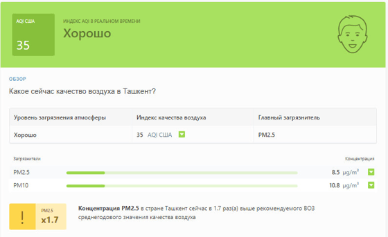 В 10:00 станция мониторинга в столице Узбекистана показывала результат в 35 AQI. Концентрация PM2.5 — в 1,7 раза выше рекомендуемого ВОЗ среднегодового значения качества воздуха.