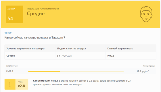 В 09:50 станция мониторинга в столице Узбекистана показывала результат в 54 AQI. Концентрация PM2.5 — в 2,8 раза выше рекомендуемого ВОЗ среднегодового значения качества воздуха.
