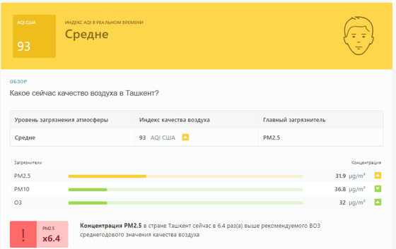 В 08:35 станция мониторинга в столице Узбекистана показывала результат в 93 AQI. Концентрация PM2.5 — в 6,4 раза выше рекомендуемого ВОЗ среднегодового значения качества воздуха.