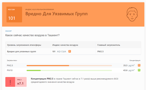 В 12:20 станция мониторинга в столице Узбекистана показывала результат в 101 AQI. Концентрация PM2.5 — в 7,1 раза выше рекомендуемого ВОЗ среднегодового значения качества воздуха.