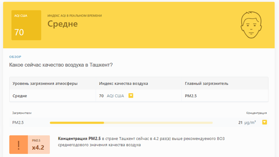 В 09:05 станция мониторинга в столице Узбекистана показывала результат в 70 AQI. Концентрация PM2.5 — в 4,2 раза выше рекомендуемого ВОЗ среднегодового значения качества воздуха.