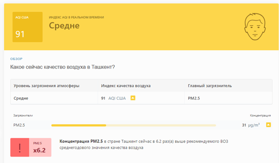 В 08:30 станция мониторинга в столице Узбекистана показывала результат в 91 AQI. Концентрация PM2.5 — в 6,2 раза выше рекомендуемого ВОЗ среднегодового значения качества воздуха.