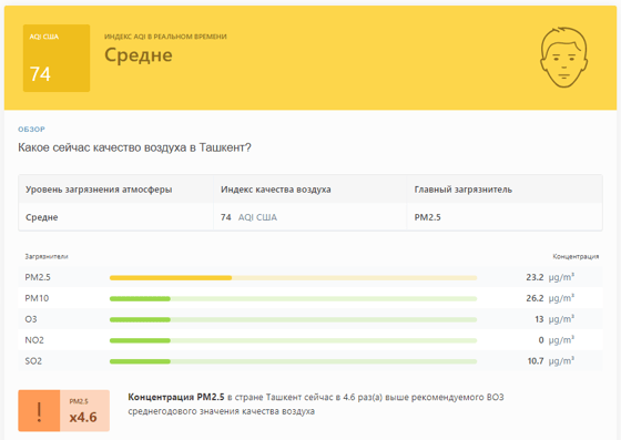В 10:00 станция мониторинга в столице Узбекистана показывала результат в 74 AQI. Концентрация PM2.5 — в 4,6 раза выше рекомендуемого ВОЗ среднегодового значения качества воздуха.