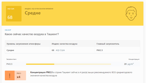 В 11:10 станция мониторинга в столице Узбекистана показывала результат в 68 AQI. Концентрация PM2.5 — в 4 раза выше рекомендуемого ВОЗ среднегодового значения качества воздуха.