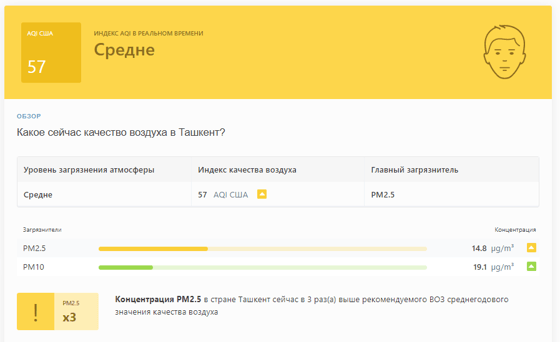 В 09:45 станция мониторинга в столице Узбекистана показывала результат в 57 AQI. Концентрация PM2.5 — в 3 раза выше рекомендуемого ВОЗ среднегодового значения качества воздуха.