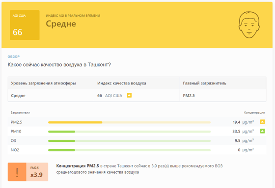 В 08:25 станция мониторинга в столице Узбекистана показывала результат в 66 AQI. Концентрация PM2.5 — в 3,9 раза выше рекомендуемого ВОЗ среднегодового значения качества воздуха.