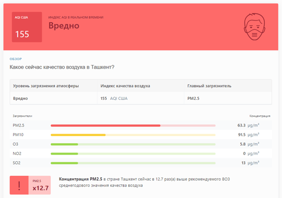 В 09:10 станция мониторинга в столице Узбекистана показывала результат в 155 AQI. Концентрация PM2.5 — в 12,7 раза выше рекомендуемого ВОЗ среднегодового значения качества воздуха.