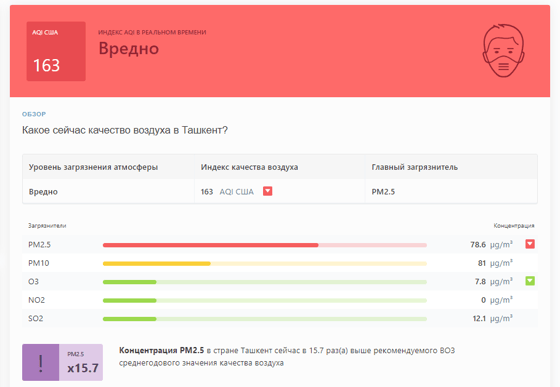 В 09:05 станция мониторинга в столице Узбекистана показывала результат в 163 AQI. Концентрация PM2.5 — в 15,7 раза выше рекомендуемого ВОЗ среднегодового значения качества воздуха.