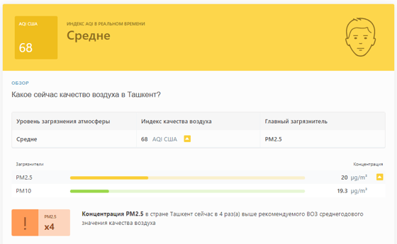 В 08:25 станция мониторинга в столице Узбекистана показывала результат в 68 AQI. Концентрация PM2.5 — в 4 раза выше рекомендуемого ВОЗ среднегодового значения качества воздуха.