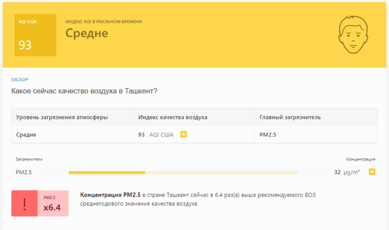 В 08:20 станция мониторинга в столице Узбекистана показывала результат в 93 AQI. Концентрация PM2.5 — в 6,4 раза выше рекомендуемого ВОЗ среднегодового значения качества воздуха.