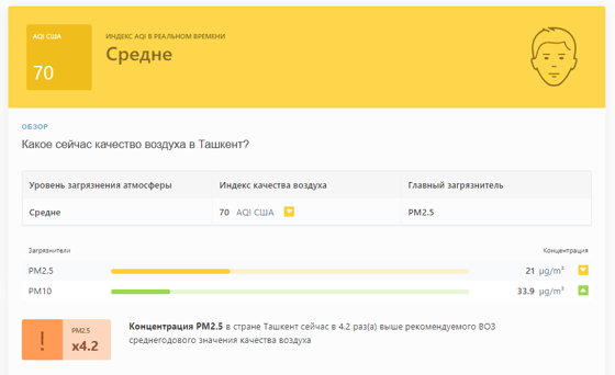 В 10:20 станция мониторинга в столице Узбекистана показывала результат в 70 AQI. Концентрация PM2.5 — в 4,2 раза выше рекомендуемого ВОЗ среднегодового значения качества воздуха.