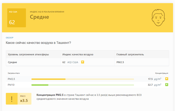 В 09:50 станция мониторинга в столице Узбекистана показывала результат в 62 AQI. Концентрация PM2.5 — в 3,5 раза выше рекомендуемого ВОЗ среднегодового значения качества воздуха.