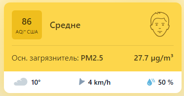 В 09:00 станция мониторинга в столице Узбекистана показывала результат в 86 AQI. Концентрация PM2.5 — в 5,5 раза выше рекомендуемого ВОЗ среднегодового значения качества воздуха.