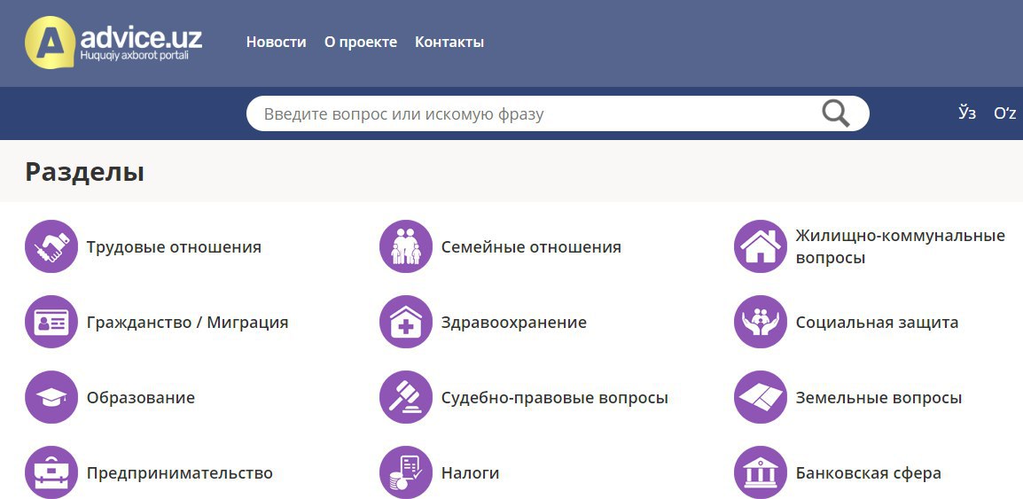 В докладе особо отмечалось, что в целях оказания бесплатной правовой консультации по различным вопросам с 1 апреля текущего года запущен правовой информационный портал «Advice.uz». За два месяца оперативно даны ответы на более 4000 правовых вопросов, поступивших на портал. 59 из них поступило из зарубежных стран, в том числе из Российской Федерации, США, Турции, Южной Кореи и Китая.