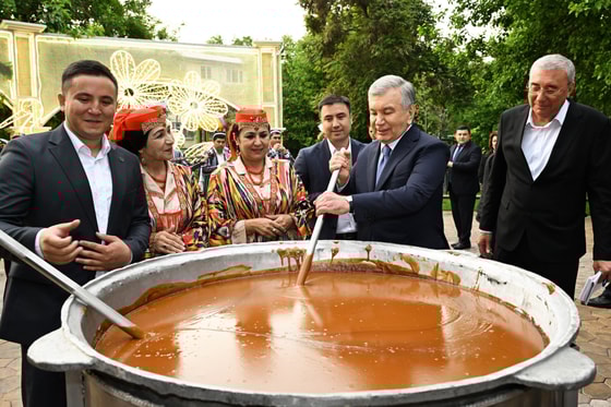 Президент также посетил организованный в махалле праздник сумаляка, пообщался с жителями и детьми.