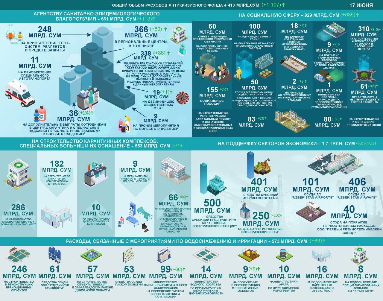 Расходы Узбекистана из Антикризисного фонда с 27 мая увеличились на 1,107 трлн сумов ($109 млн). Данные были опубликованы Минфином в Telegram-канале.
