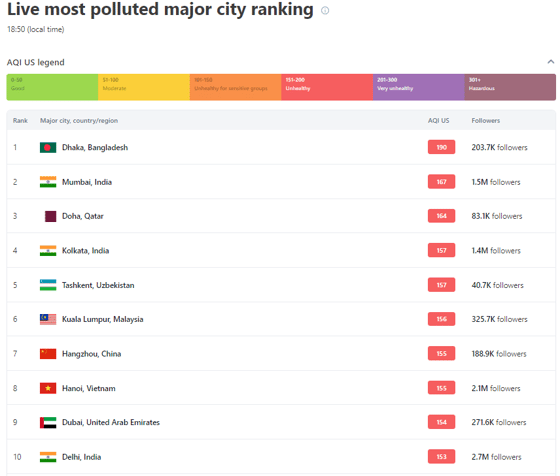 По состоянию на 18:50 станция мониторинга в столице Узбекистана показывала результат в 157 AQI.