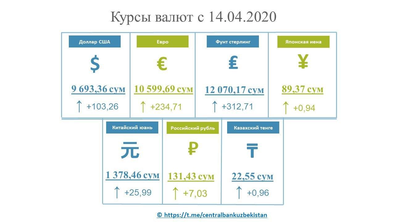 Центральный банк Узбекистана установил новые курсы иностранных валют по отношению к суму. Курс доллара составил 9693 сумов (рост составил 103 сума за неделю), а евро – 10599 сумов (рост 234 сума за неделю).