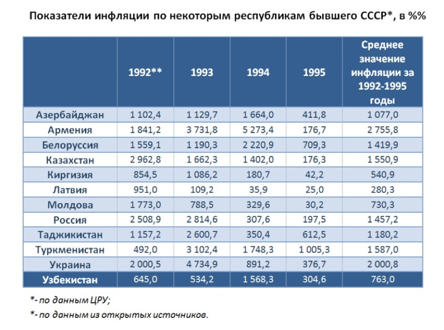 Сложилось стойкое мнение, что в Узбекистане не было шоковой терапии. Но посмотрите лишь на уровень инфляции в стране (данные ЦРУ): в 1993 году индекс потребительских цен составил 534,2 процента; в 1994 году – 1 568,3 процента; в 1995 году – 304,6 процента. Отечественный Центральный банк подтверждает, что ставка рефинансирования в 1995 году достигала 300 процентов.